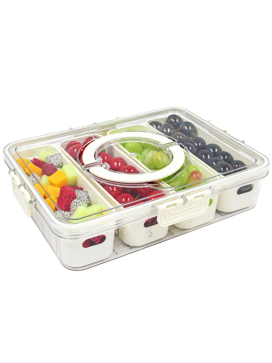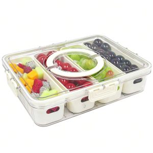 H2512P Bandeja De Servir Dividida, Recipiente Para Bandeja De Bocadillos Con Tapa Y Mango, Caja De Almacenamiento De Alimentos Portátil De 4 Compartimentos, Bol De Bocadillos, Caja De Conservación, Organizador De Verduras Para Refrigerador (4 Compartimentos)