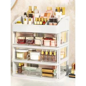 H1667P 1 pieza Caja de almacenamiento de cosméticos de plástico transparente de 3 capas para dormitorio y sala de estar, con función a prueba de polvo y humedad, adecuada para guardar lápices labiales, bases, aceites esenciales, máscaras faciales, aceite removed