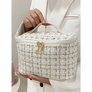 H1917P 1 pieza de bolso de maquillaje portátil marrón a cuadros de moda simple de gran capacidad para viajes, para mujeres y niñas. Bolsa de maquillaje, bolsa de cuidado de la piel y bolsa de tocador para empacar. Esencial para viajes, cruceros, dormitorios. Reg