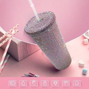H1893P 1 pieza Vaso de bebida helada de plástico de doble capa creativo con decoración de strass, vaso reutilizable de plástico para bebidas frÃas, café, té, etc. Adecuado para fiestas en verano e invierno