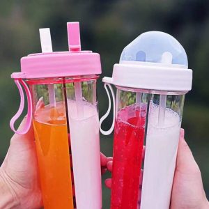 H1591P 1 pieza 420/600ml Botella de agua de gran capacidad, doble taza de bebida con doble pajilla para parejas, copa de agua portátil de uso dual de un solo vaso para dos bebidas, fácil de limpiar y reutilizable, adecuada para regalos de vacaciones a amigos, of