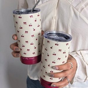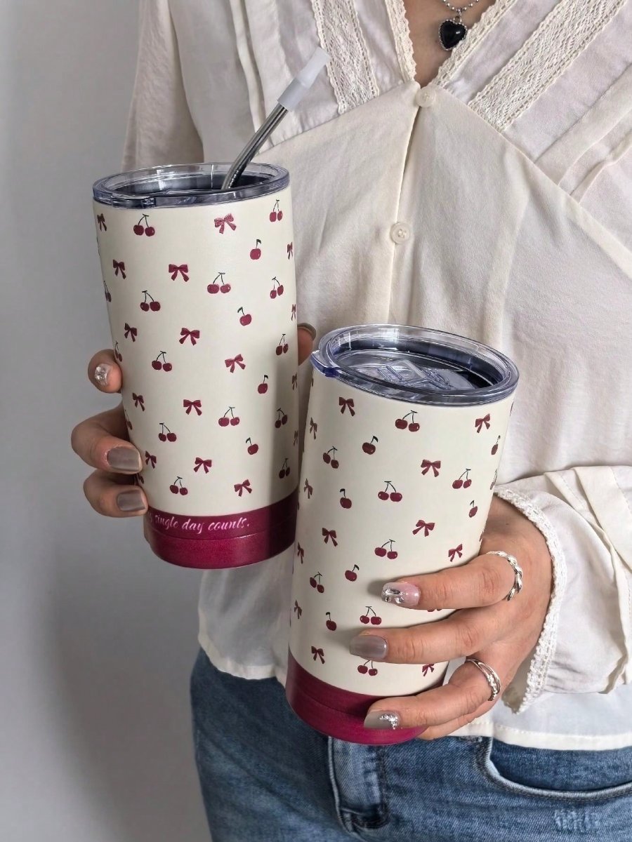 H1659P 1 pieza Botella aislada para agua de 20oz/600ml con cereza roja y lazo con cubierta, botella térmica para viaje, taza para agua, frasco al vacÃo, taza de café para camping, regalo para festivales y cumpleaños (no incluye la pajilla)