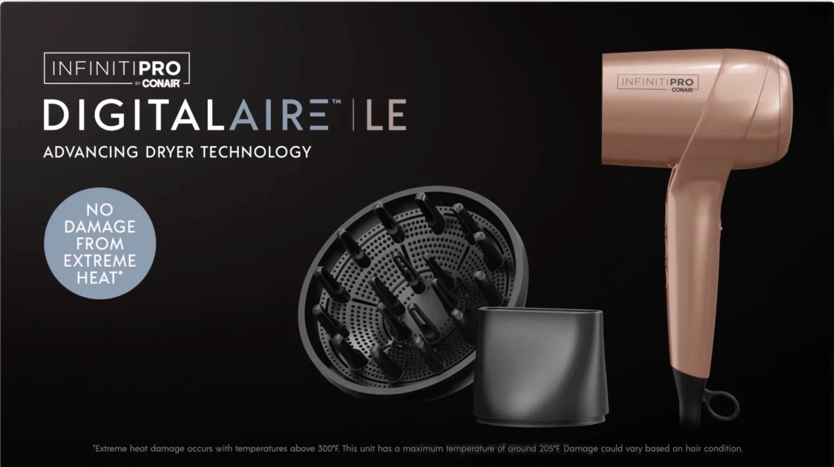 Conozca el secador de pelo Conair InfinitiPRO DigitalAIRE LE: el futuro del secado del cabello. Con la tecnologÃa DigitalAIRE de próxima generación, este secador ofrece hasta 3 veces más presión de aire, en comparación con otros secadores de motor Conair DC, para obtener resultados más rápidos y de calidad profesional. Su diseño elegante y ligero lo hace un 30 por ciento más ligero que otros secadores de motor Conair AC, mientras que su tecnologÃa iónica combate el encrespamiento y los flyaways, dejándote con un cabello suave y brillante. Un verdadero tiro frÃo establece su estilo en su lugar, y el cable extra largo de 7 pies le da la libertad de moverse. Con 3 ajustes de calor y 2 velocidades, además de un concentrador y difusor para un estilo personalizado, esta secadora no es solo una herramienta, es una forma de arte.