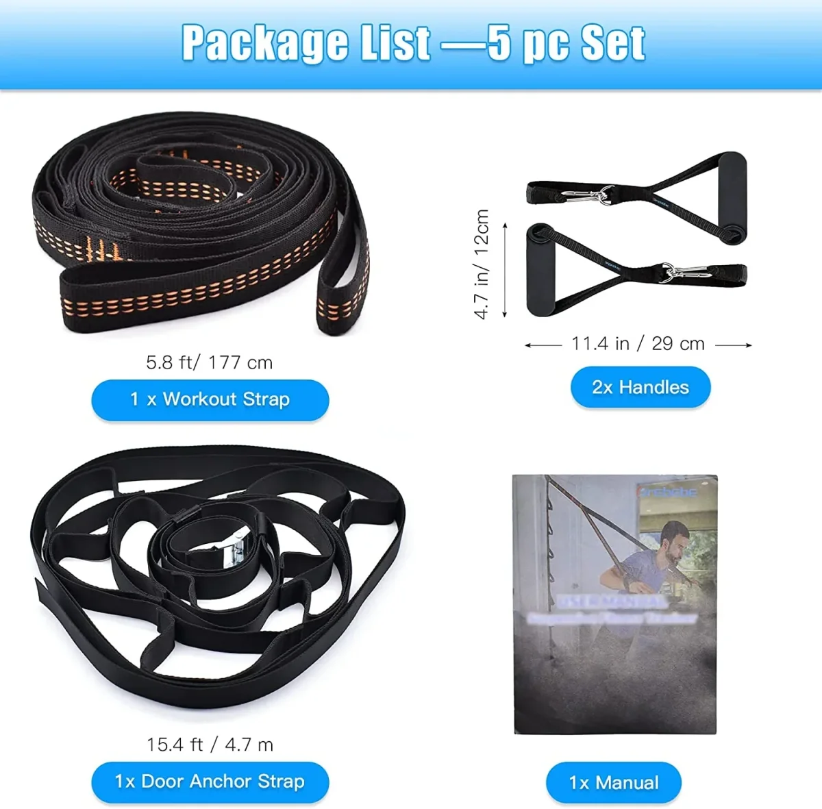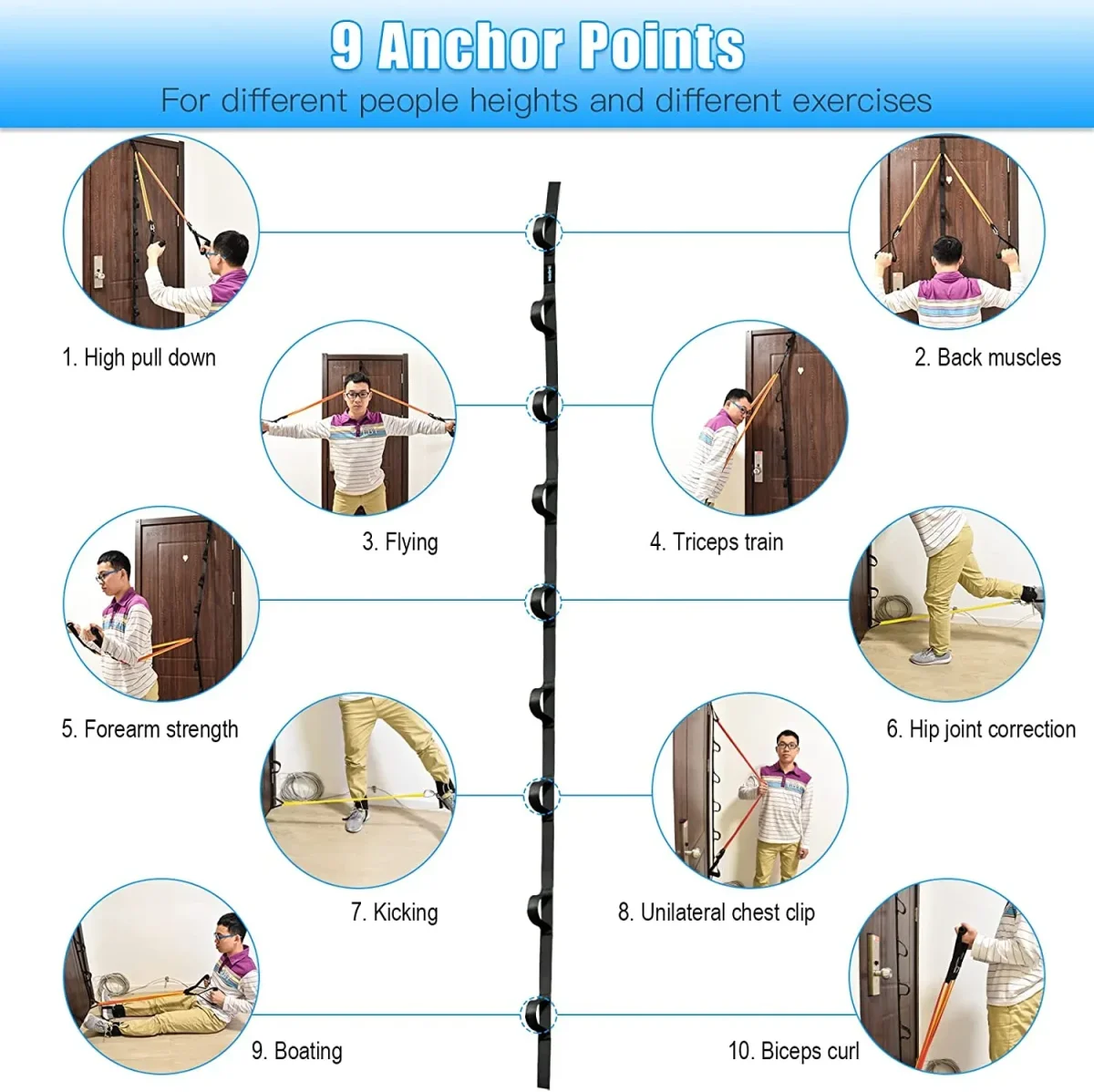 Brebebe Our door anchor straps have five anchor rings and D-rings, we have black 50lb, blue 40 lb, and red 20 lb for resistance straps (Optional foldable purchase kit, or separate door anchor straps) Five anchor rings can meet your needs for Different needs of upper body exercise, D-ring buckle can meet your legs, buttocks, and other exercises so that you can feel the accumulation of muscles after each stretch. This door anchor strap was made of Top Quality Material Same as a Car Safety Belt, sturdy and durable. Secondly, Compared old door anchor, the new version is Convenient to Use and Save. Lastly, the upgraded version is equipped with a storage bag, which allows you to work at home or travel. The bands are made of latex material, high quality and durable, no harm to human skin, and can be used with confidence. The strengths of the bands are yellow 5-15 pounds, red 15-35 pounds, black 25-65 pounds, and purple 35-85 pounds.