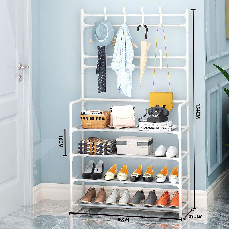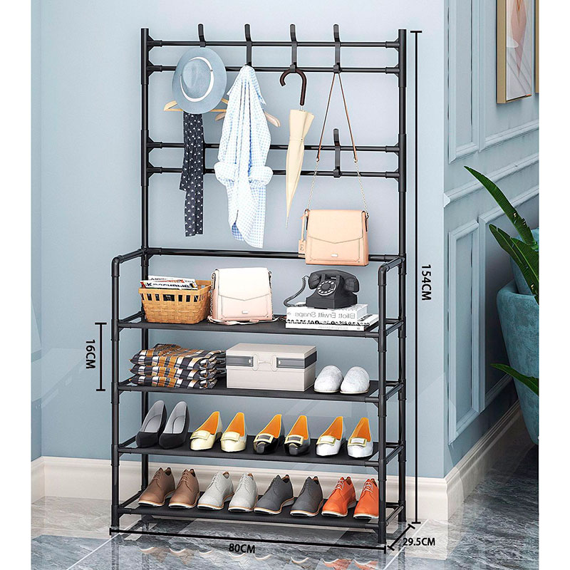 Este estante organizador es una organizadora de zapatos multifunción de 4 niveles con percha que brinda una combinación perfecta de estante, perchero y banco de almacenamiento de zapatos; para que puedas colgar tu ropa, bolsos, paraguas y almacenar tus zapatos, cajas de almacenamiento o bolsos.