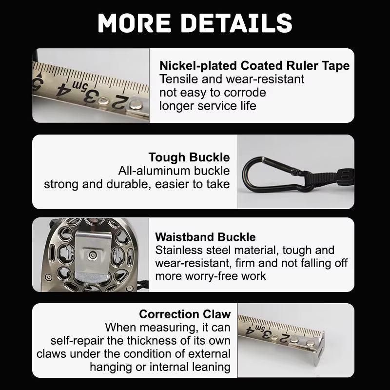 【Componentes de calidad superior y retracción libre】 que incluye un eje de acero inoxidable, resorte de cinta de alta tensión y hebillas duraderas. La combinación de estos componentes garantiza una durabilidad óptima y la longevidad de la cinta métrica.