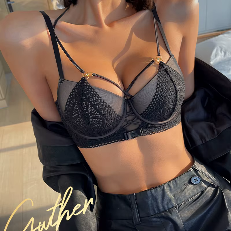 H3510P Conjunto de sujetador de realce con agujeros para mujer, ropa interior Sexy, vendaje clásico, correa ajustable, Halter, encaje negro, tentación, moda