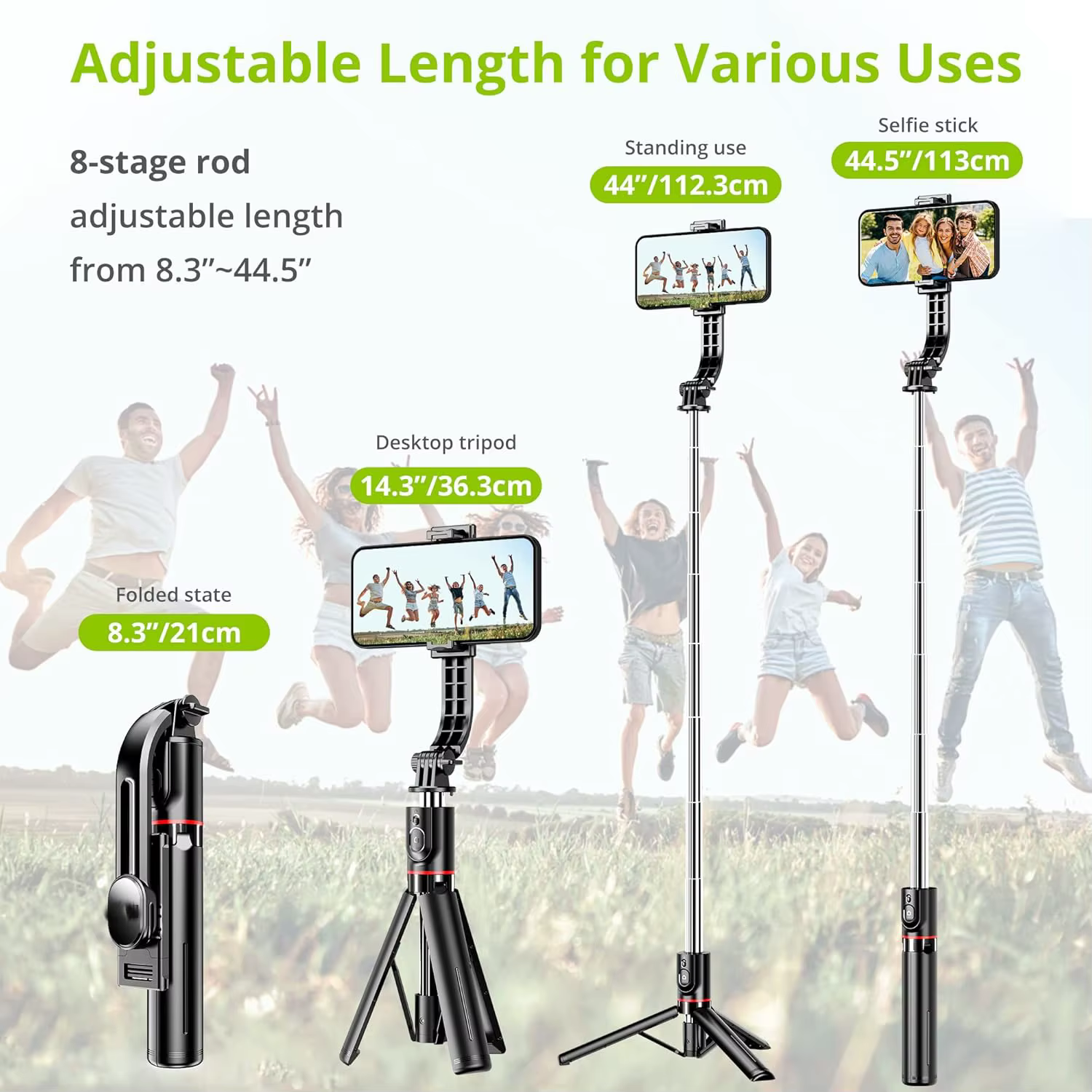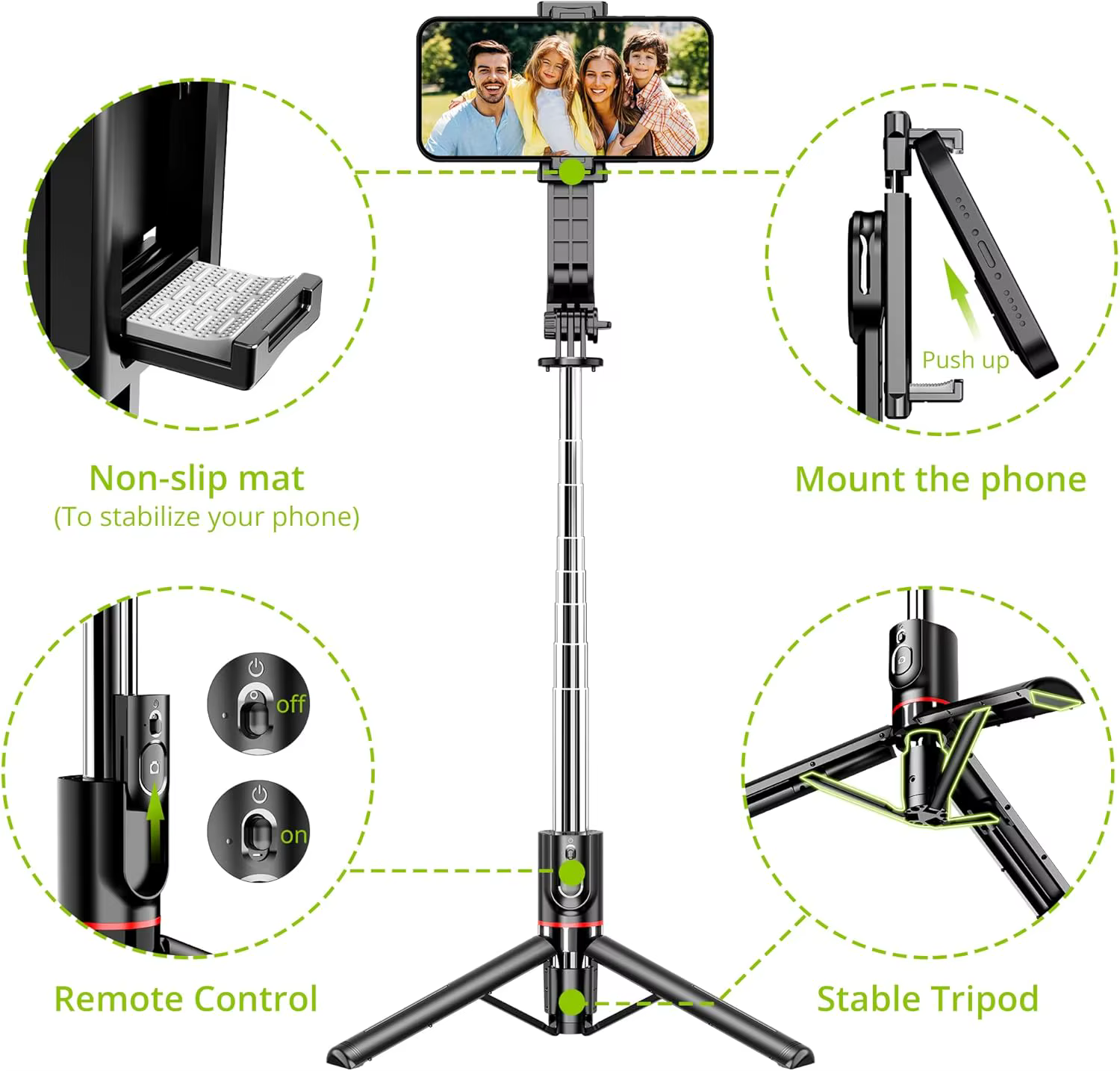 • Longitud extendida: con una longitud extendida de 1160 mm, este palo para selfies ofrece un mayor alcance y flexibilidad para capturas perfectas.