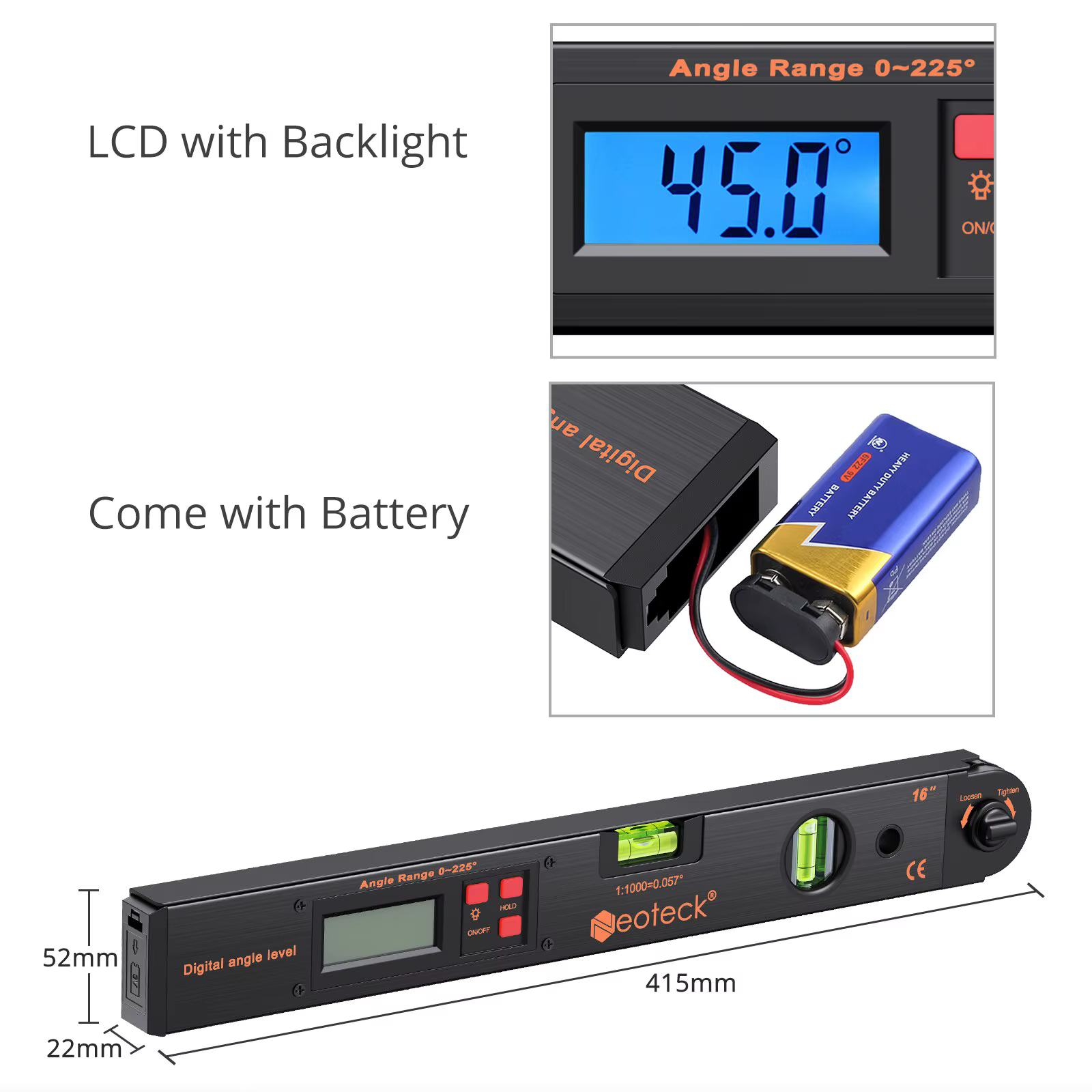 Es un dispositivo de medición digital del ángulo cuya lectura es más fácil y exacta que la otra escala indicó el nivel del ángulo. Está diseñado principalmente para aplicaciones que implican la alineación para los trabajadores de la madera, la medida y la definición de los ángulos exactos, tales como bandejas, techos inclinados y pasamanos. También se puede utilizar como nivel de burbuja para medir rápidamente el ángulo horizontal y vertical (NOTA: No es un nivel digital).