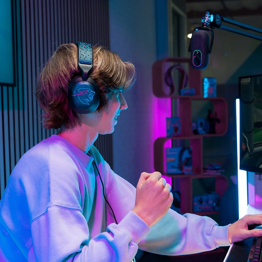 Mejora tu configuración de juego con la ingenierÃa de audio más loca que hemos creado, y está aprobada por MrBeast. Nuestros controladores personalizados de 50 mm ofrecen un sonido de calidad de laboratorio alucinante para los juegos, mientras que el micrófono certificado TeamSpeak garantiza una comunicación de siguiente nivel. El legendario diseño azul MrBeast x JLab se destaca en las transmisiones, mientras que la comodidad de Cloud Foam lo mantiene jugando por más tiempo. Juego como una bestia con JLab x MrBeast!