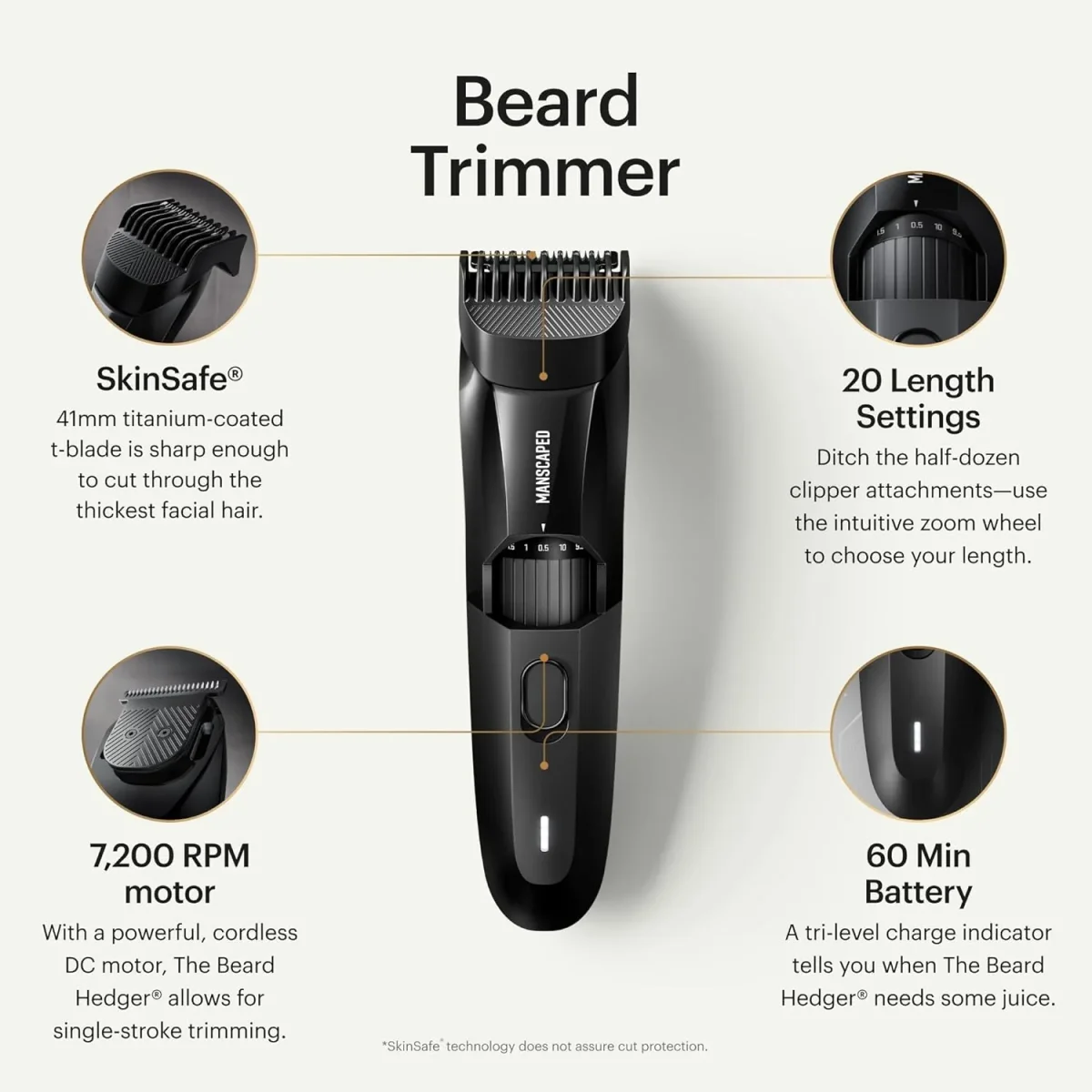 COMPRUEBE SU CABEZAL: Con un potente motor de CC inalámbrico y una hoja en T recubierta de titanio de 1.614 in, el Beard Hedger es lo suficientemente afilado como para cortar el vello facial más grueso con facilidad y sin necesidad de aceite de cuchilla.