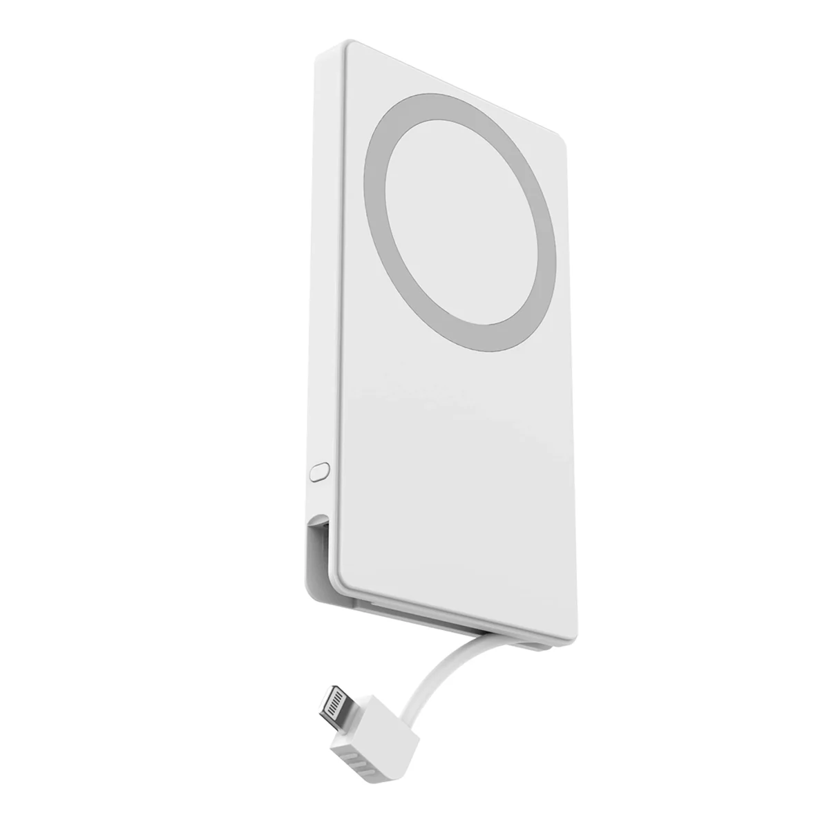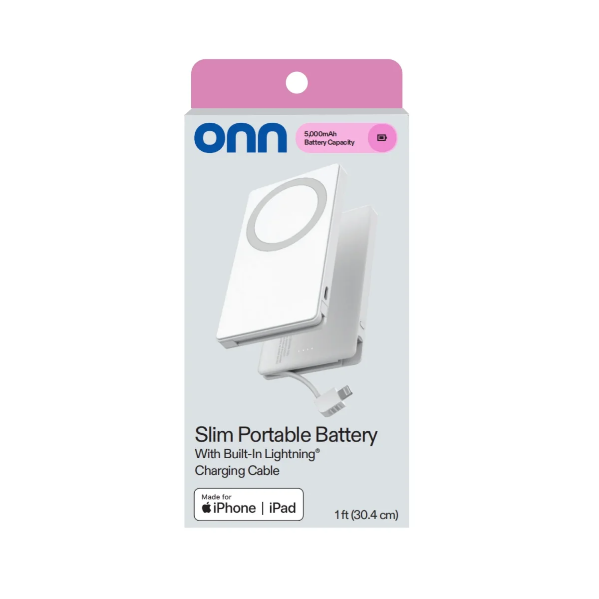 - onn BaterÃa portátil de 5.000 mAh con cable Lightning incorporado, certificado MFI, anillo de fijación magnética, blanco