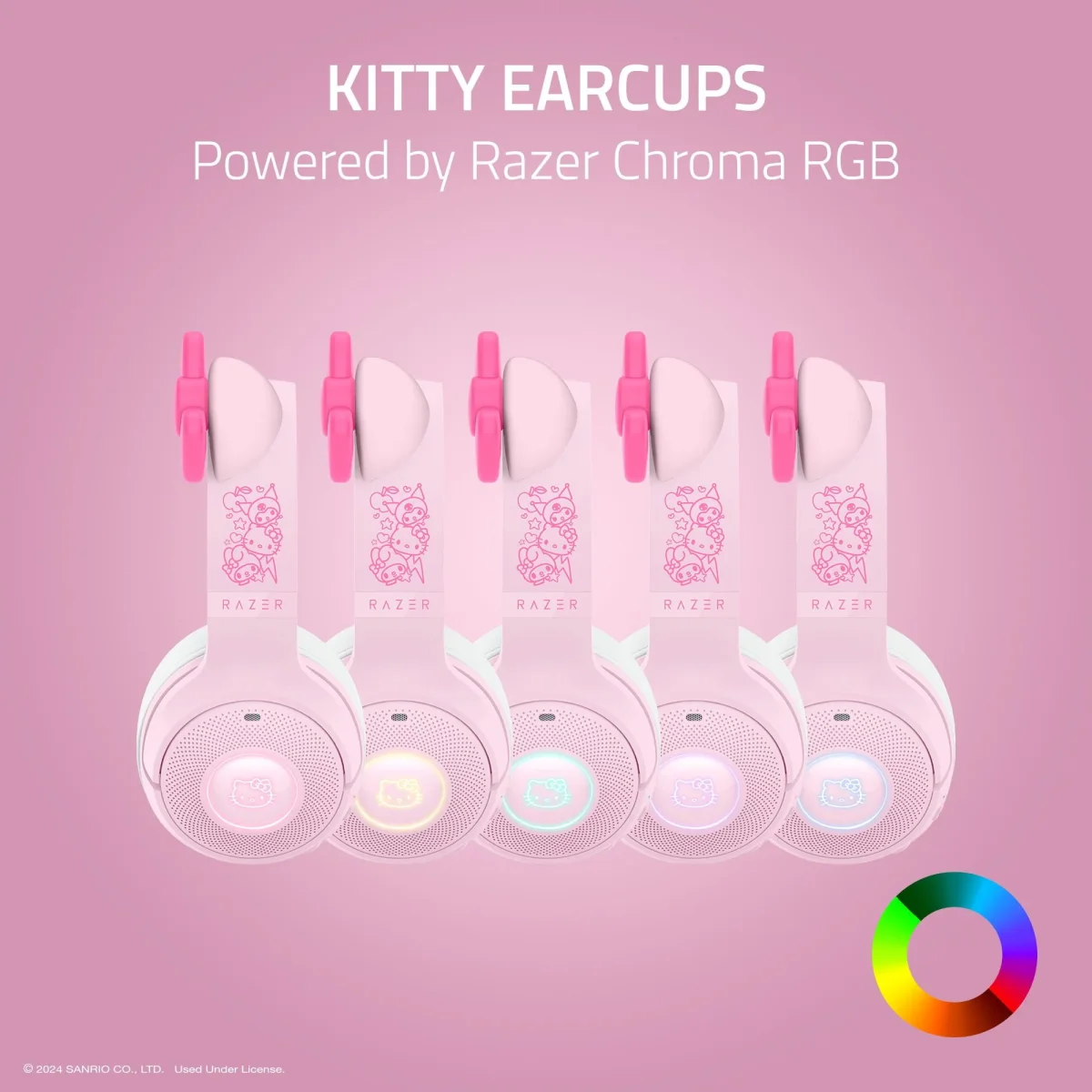 Razer Kraken kitty Auriculares Bluetooth, Hello Kitty y Amigos Edición. Desata tu estilo kitty asesino en cualquier lugar con el Razer Kraken kitty V2 BT-a auriculares inalámbricos Bluetooth para juegos y transmisión IRL. Desarrollado por Razer ChromaTM RGB, muestra tu personalidad única para que todos la vean, mientras llevas tu pasión al siguiente nivel con un conjunto completo de funciones mejoradas.