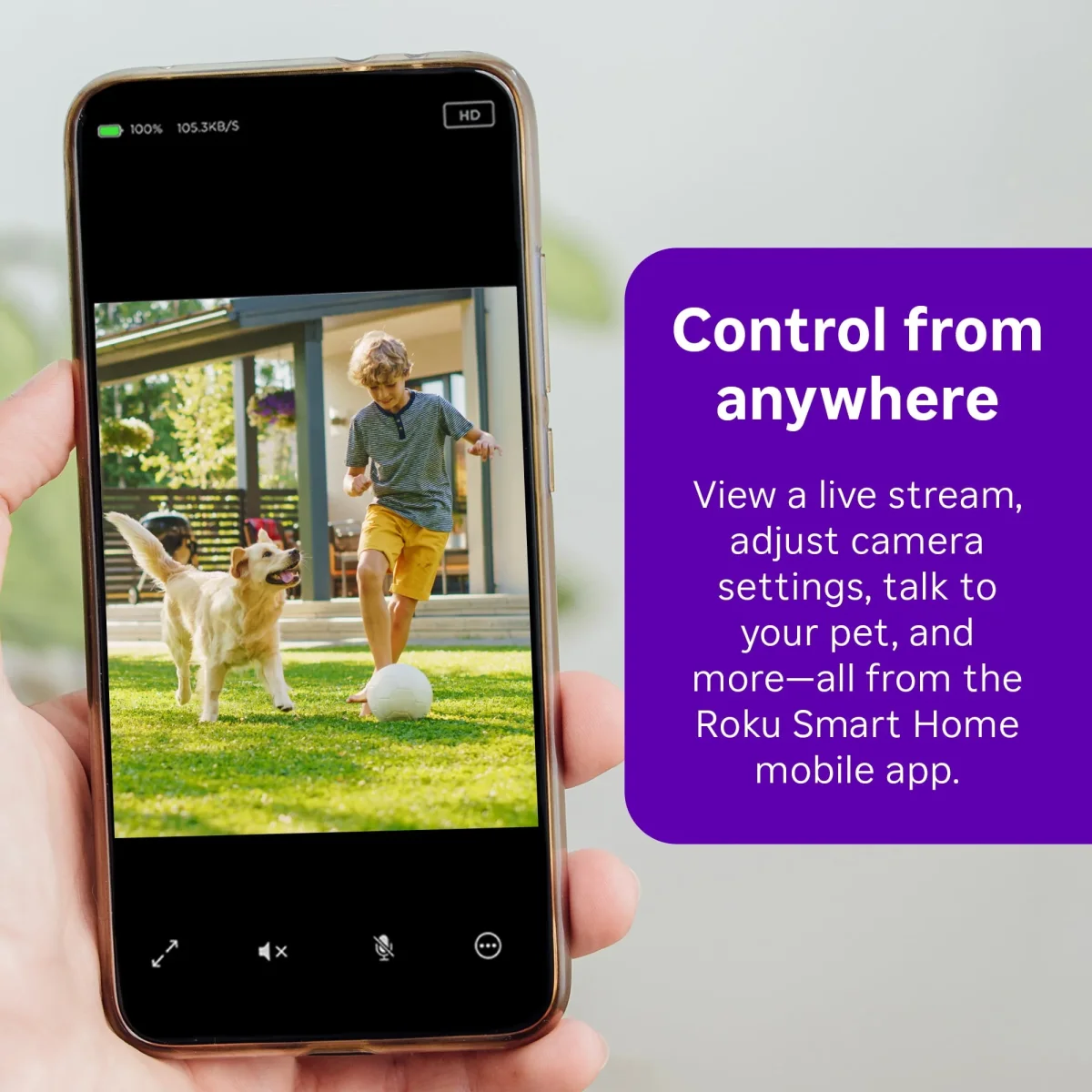 - Revisa tu casa desde tu teléfono: visualiza una transmisión en vivo, ajusta las zonas de detección de movimiento, habla con tu mascota y mucho más desde la aplicación móvil Roku Smart Home.