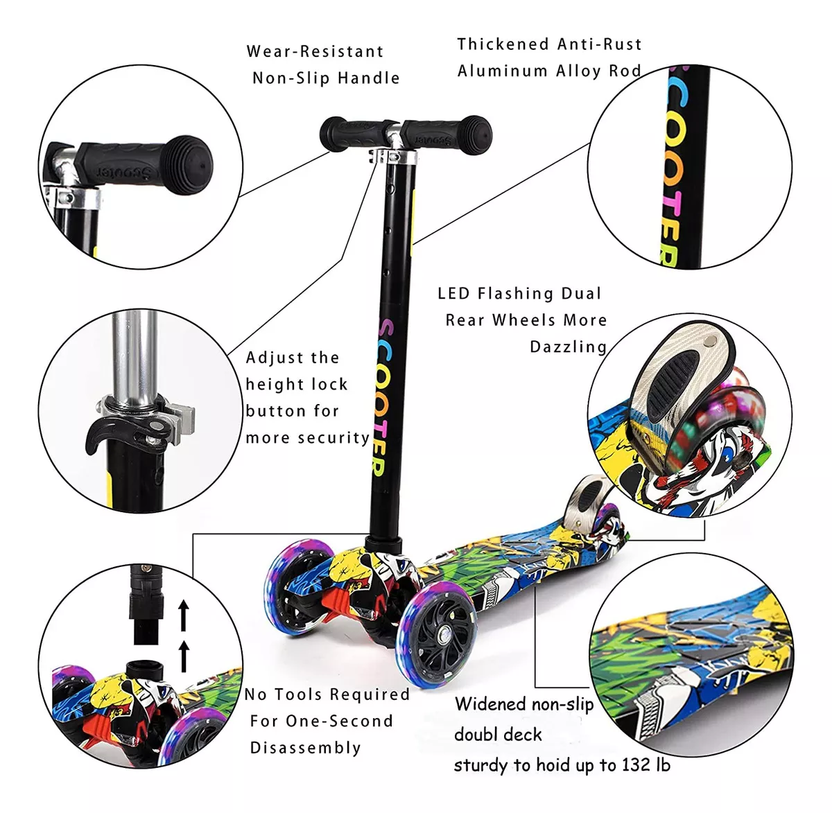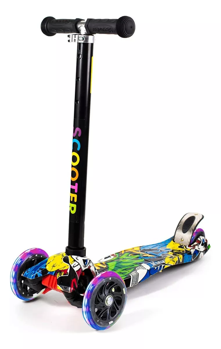 La Patineta de 3 Ruedas con Luces LED – Grafiti es la opción ideal para niños de 3 a 8 años que buscan diversión, seguridad y estilo. Con un diseño vibrante de grafiti y luces LED en las ruedas, esta patineta ofrece una experiencia de patinaje única. Sus tres ruedas proporcionan mayor estabilidad, lo que la convierte en una excelente opción para los más pequeños que están aprendiendo a patinar.