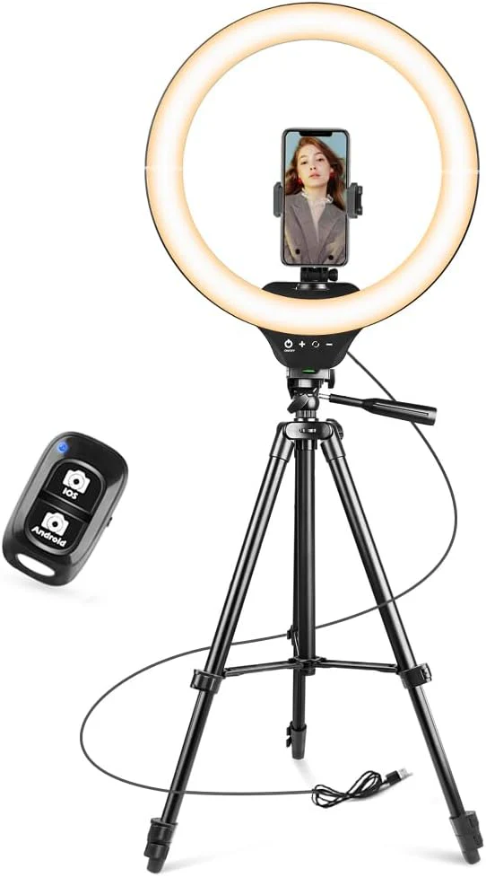 Accesorios versátiles: el control alimentado por USB ayuda a proteger tu seguridad mientras mejora el brillo del anillo de luz. El soporte para teléfono tiene resorte y se extiende hasta 5.3 pulgadas de ancho, es compatible con casi todos los teléfonos inteligentes con o sin funda.