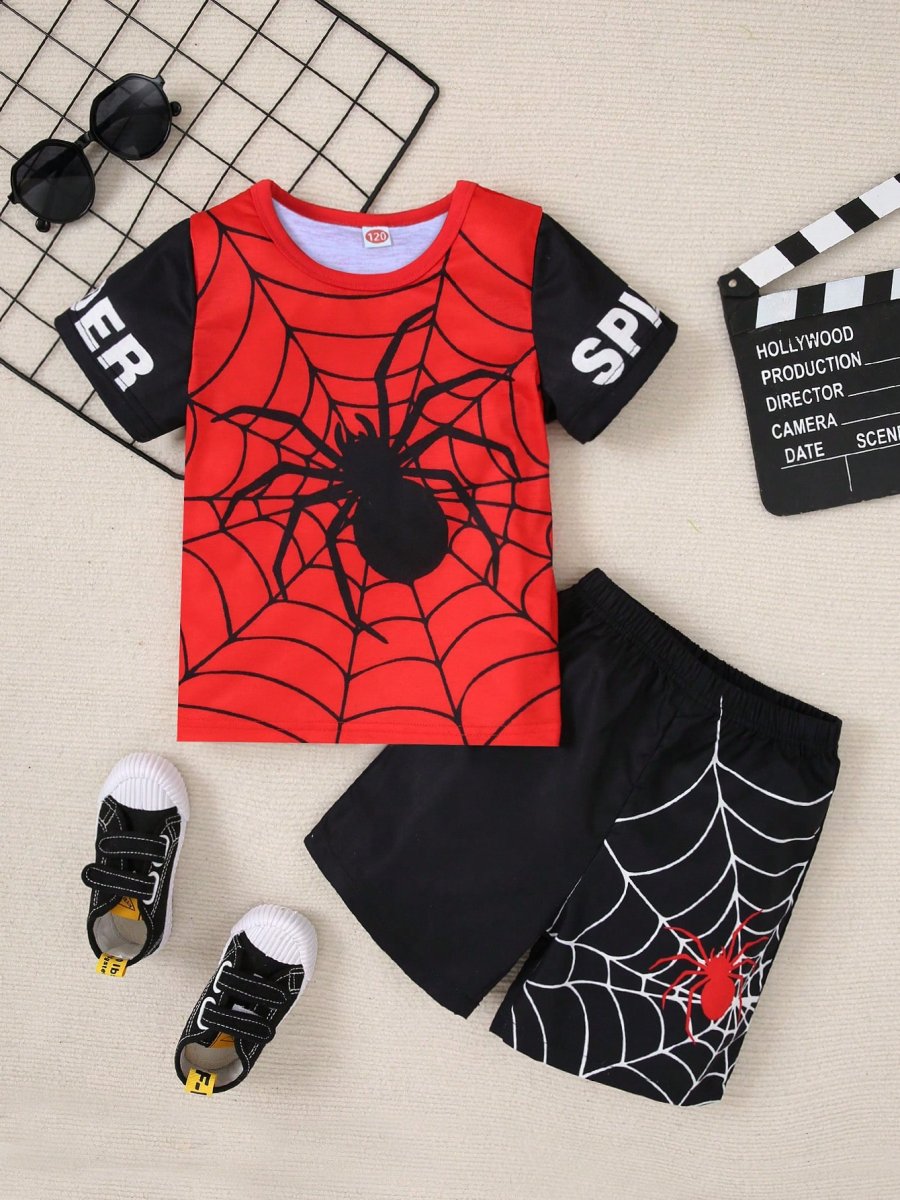 H3390P Conjunto De Top Y Pantalones Cortos Para Niño, Impresión En Bloques De Color De Araña Y Manga Corta Para El Verano